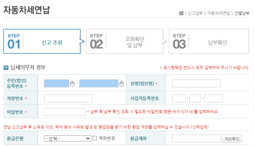 별도의 가입 과정 없이 개인정보 입력 후 신고하기를 누르면 차량정보와 함께 납부해야할 금액이 나옵니다.