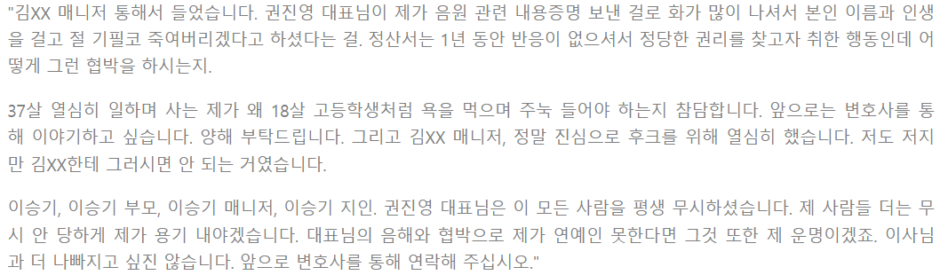 이승기 0원 정산금에 대한 내용증명 요구...소속사 대표 분노해 죽여버리겠다 협박