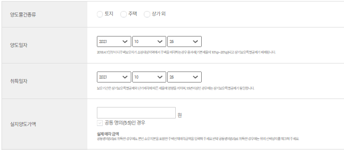 3. 양도물건의 종류, 양도일자, 취득일자, 실지양도가액, 실지취득가액 등을 모두 입력한 후 계산을